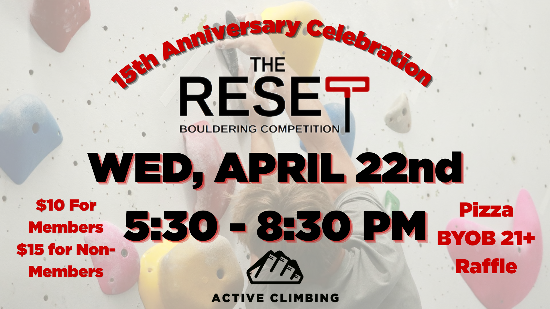 Our next event is Wednesday, April 22nd, 2026 from 5:30 - 8:30 PM. Members climb for $10, non-members for $15! Join us for friendly competition, pizza, and a raffle. Folks 21+ can BYOB. See you then!